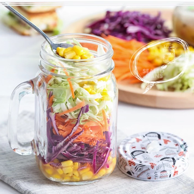 The Mason bottle is separated from the bottle and the lid. The lid has one-piece, two-piece, perforated, and even a piggy bank lid. The secret to make it sealed is the two-piece lid. Put the glass bottle in hot water to keep it at a certain temperature. Put the finished hot jam into the bottle, then close the lid and put it back in hot water to heat it, and finally put it at room temperature. cool down.
